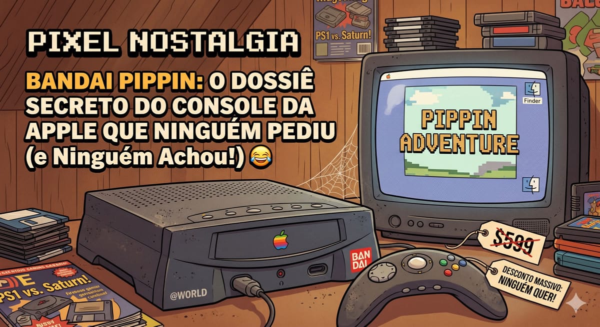 E aí, galera da velha guarda! Pixel Nostalgia aqui, direto do bunker onde a gente guarda os cartuchos mais empoeirados e as histórias mais cabulosas dos 8 e 16 bits (e uns ‘outsiders’ bizarros, claro!). Hoje, a gente vai desenterrar uma relíquia tão esquecida que muita gente nem sabe que existiu: o Bandai Pippin. Se liga, porque essa é uma daquelas máquinas que tentaram ser tudo ao mesmo tempo e acabaram não sendo nada, mas com um toque de humor que só a história pode nos dar!